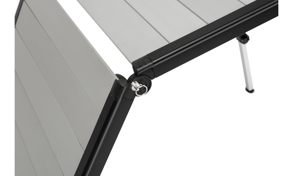 Hochwertiger Outdoor- und Campingtisch mit spezieller Klappplatte aus besonders wetterfesten und verschleißfesten Aluminiumlamellen.