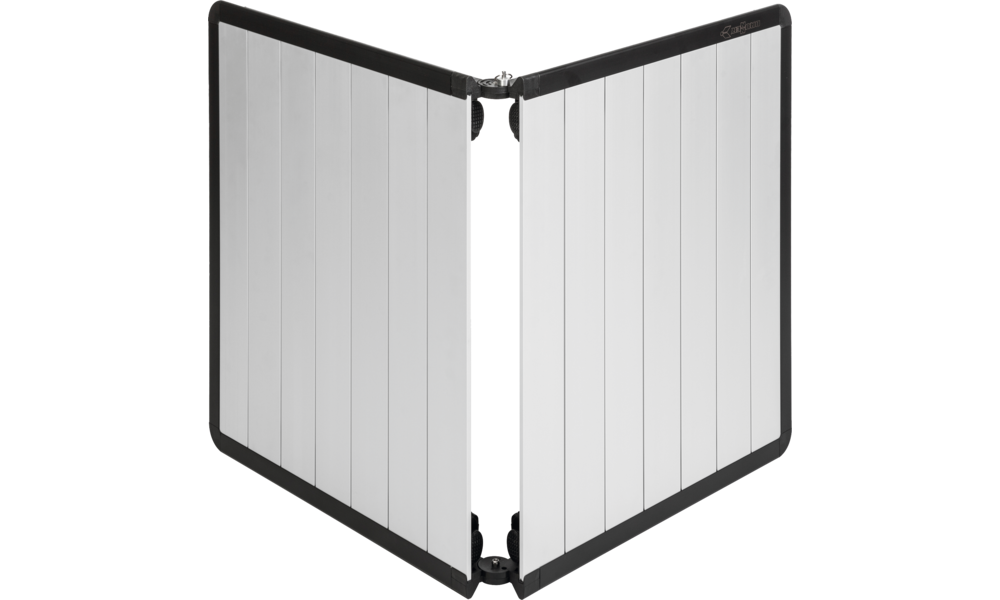 Pulverbeschichtetes Metallgestell mit höhenverstellbaren Beinen. Mittig zusammenklappbar, leicht transportier- und lagerbar. Inklusive Tragetasche (100 %