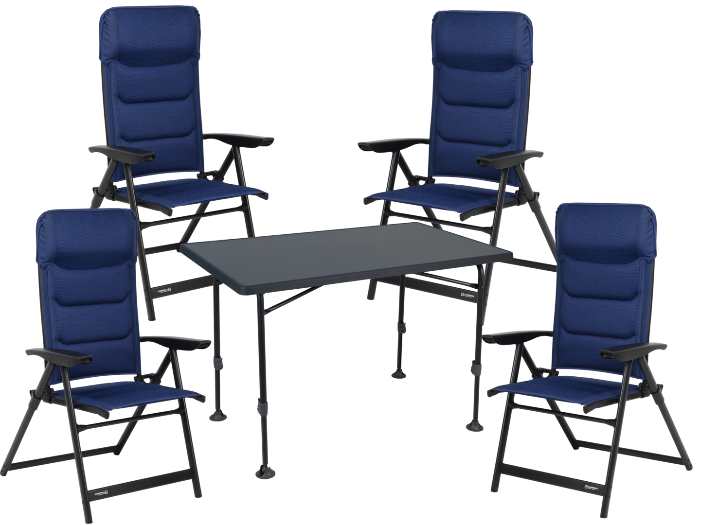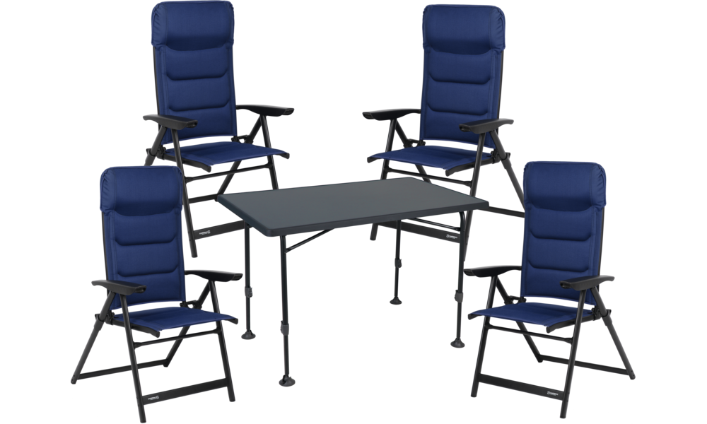 Set bestehend aus 4 x Sessel CAMPERDICE Evolution in blau (Nr. 22100) und 1 x Tisch CAMPERDICE Evolution 120 (Nr. 21199)