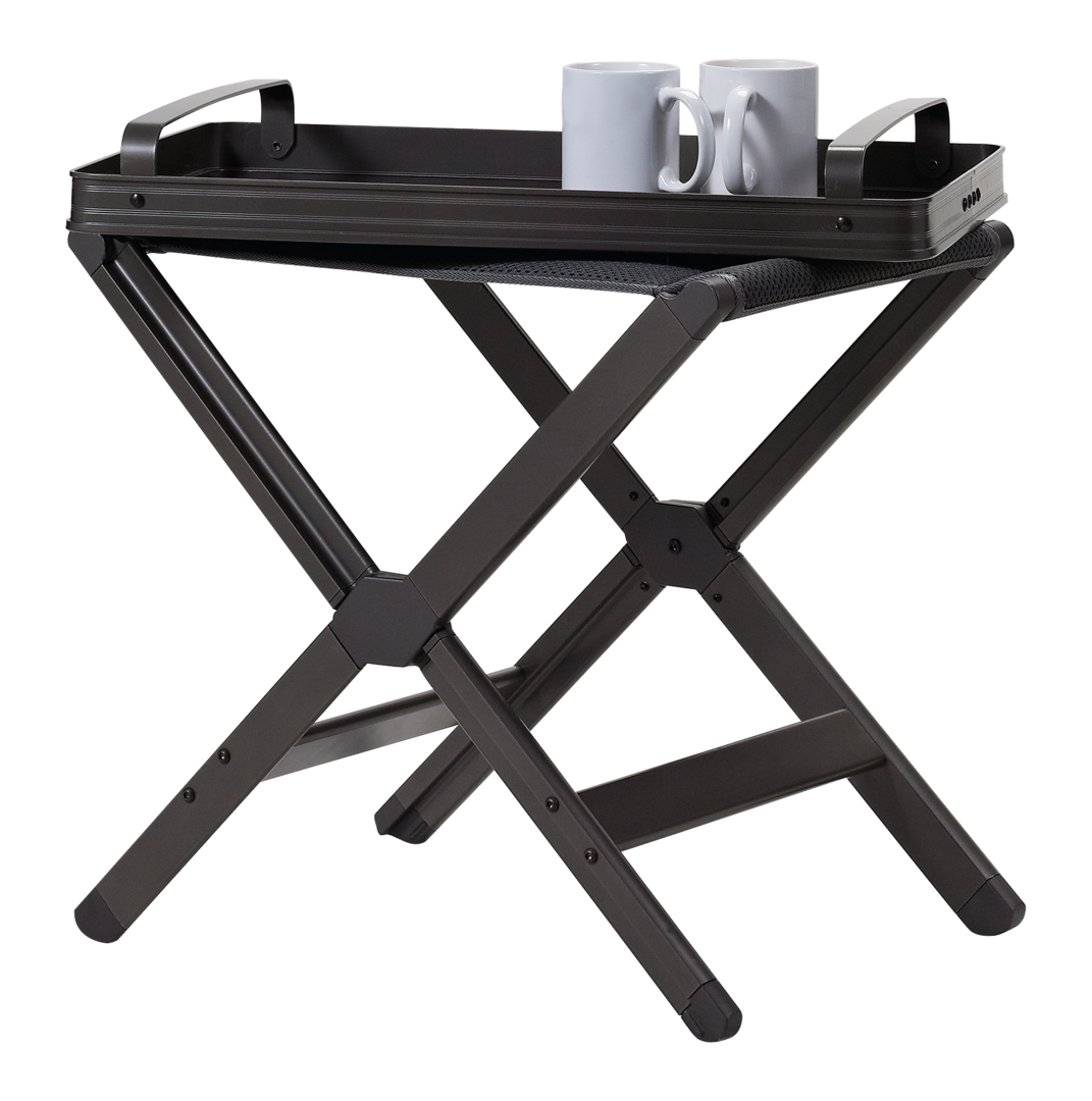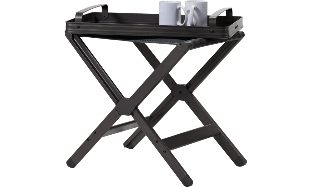 Hocker-Set DYNAMIC & TOP. Dieses Set, bestehend aus einem bequemen, stabilen Falthocker und aus einer Tischplatte, ist eine multifunktionale Ergänzung zu den Stühlen. Der Hocker kann auch als Beinauflage genutzt werden. Die Tischplatte kann mittels ausklappbaren Griffen zu einem Serviertablett umgewandelt werden. Bezug aus Dura-Dore® 3D Mesh Gewebe (100 % Polyester). Belastbarkeit Hocker 100 kg, Tischplatte 10 kg.