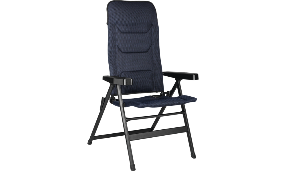 Klappsessel mit pulverlackiertem Aluminium-Gestell, atmungsaktivem FULL-3D Bezug (100 % Polyester) und metallverstärkten Armlehnen zur Rückenlehnenverstellung.
