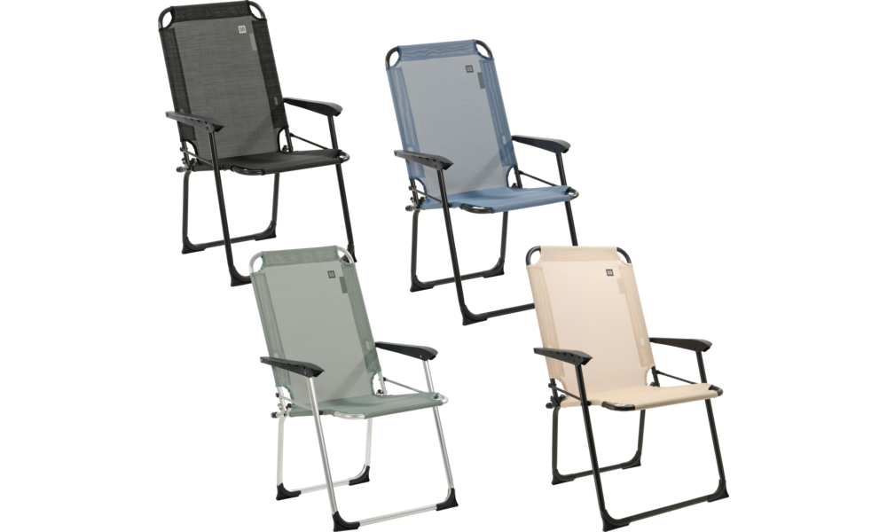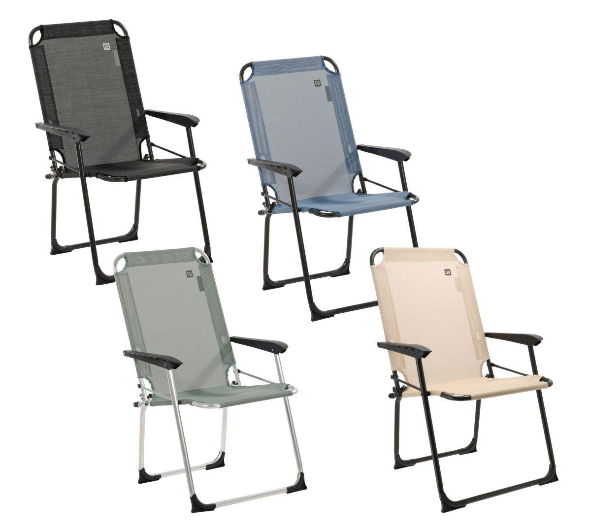Kompakter und leichter Stuhl mit Aluminiumrahmen und Textilene-Polsterung (100 % Polyester). Sehr kompakt faltbar und trotzdem bequem, ideal wenn der Stauraum begrenzt ist.