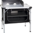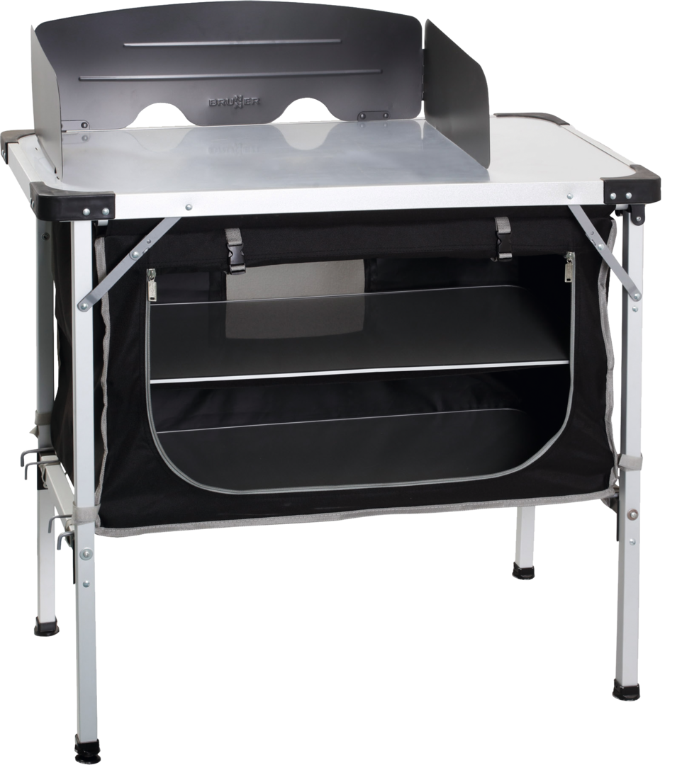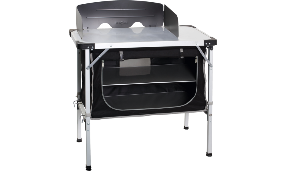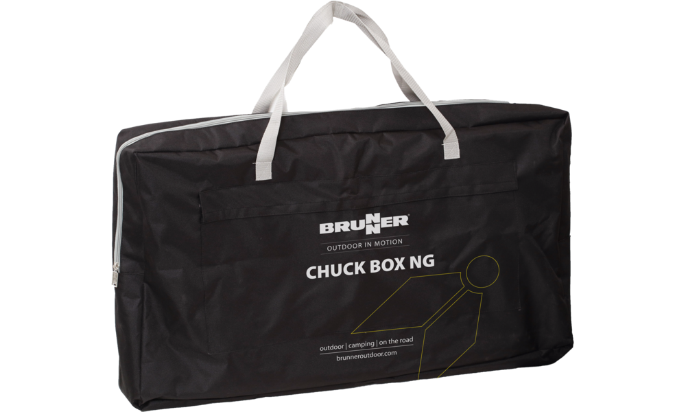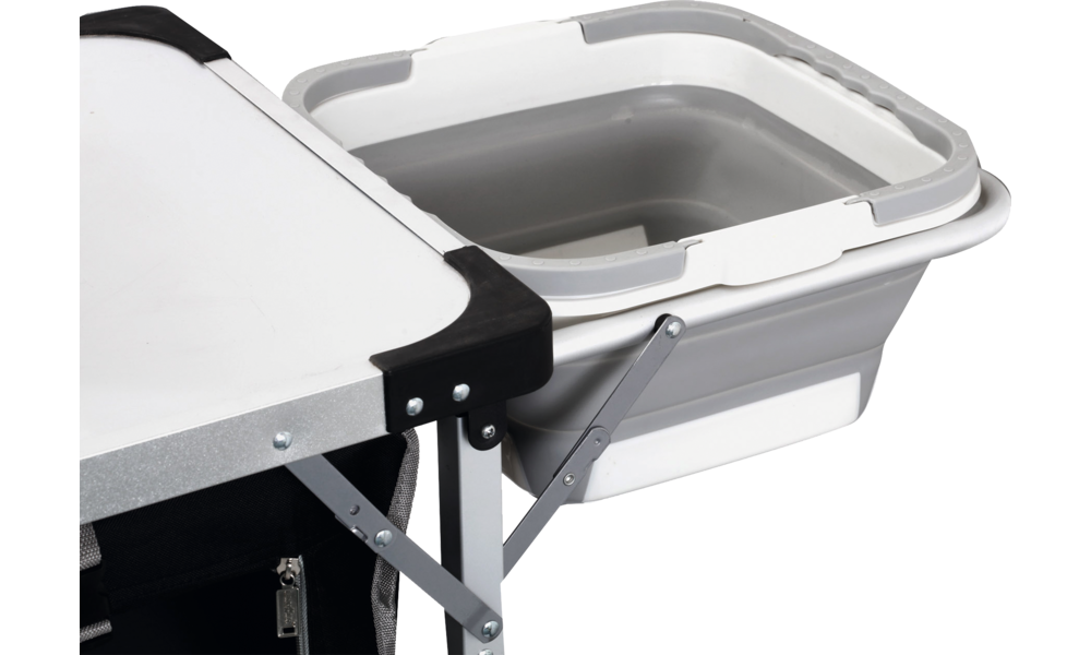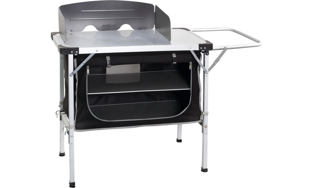 Küchenbox CHUCK BOX NG. Küchenbox mit extra starkem Aluminiumrahmen und großer MDF-Arbeitsplatte mit umlaufender Aluminiumeinfassung. Die gesamte Küchenbox wird in der mitgelieferten Tragetasche (100 % Polyester) verpackt. Kann unkompliziert aufgestellt und abgebaut werden. Der große Schrank mit Reißverschlusstür bietet großzügige Ablagemöglichkeiten für Lebensmittel und Kochutensilien. Mit einem seitlichen Klapprahmen für ein faltbares Arbeitsspülbecken.