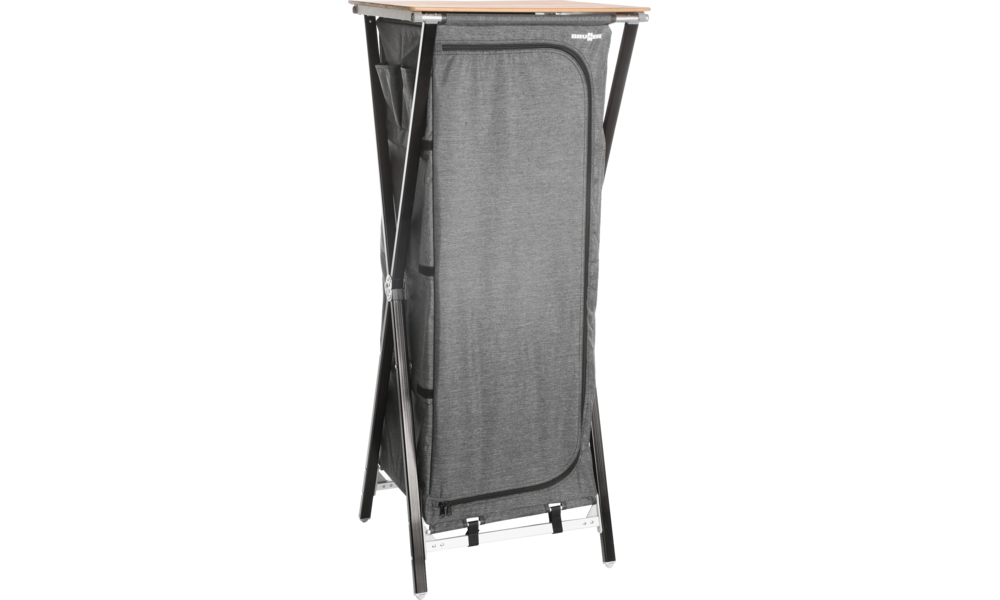 Alle Füße sind höhenverstellbar. Obenliegenden Arbeitsplatte aus Bambus. Bezug 100 % Polyester. Mountless-System. Inklusive Tragetasche.