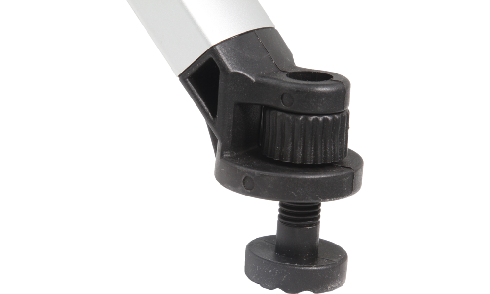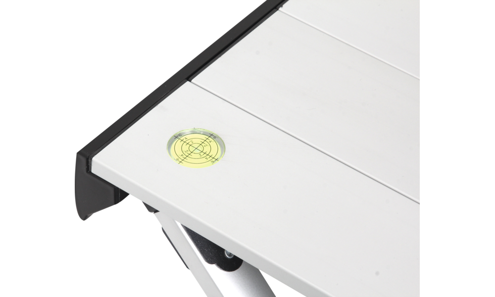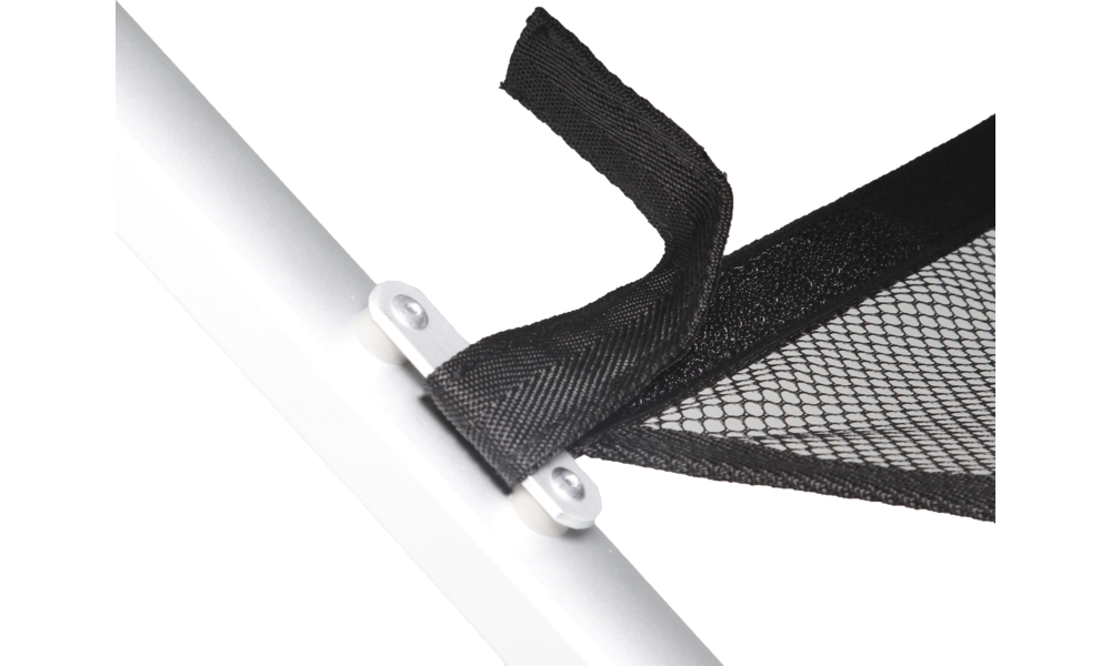 Gestell mit halbovalem Aluminiumrohr, spaltenlose Rolltischplatte, klappbare Beinkonstruktion, höhenverstellbares Tischbein, neues Befestigungssystem für die Tischplatte, praktische Netzablage, inklusive Tragetasche (100 % Polyester).