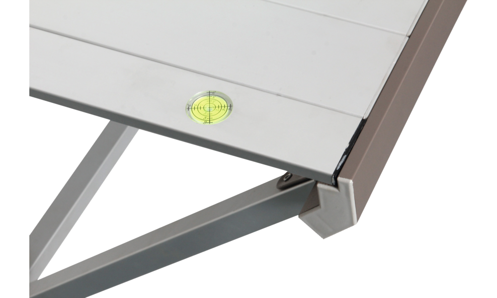 Patentierter Aluminiumtisch mit Rollplatte und einem speziellen, einfach zu montierenden Klapprahmen.