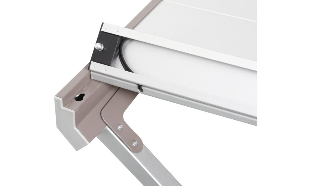 Eigenschaften: Rolltischplatte mit silber eloxierten Lamellen (Gapless-System), mit integrierter Wasserwaage, sehr stabiler Rahmen aus Aluminium-Vierkantrohren und zentraler Stabilisierungsstange, höhenverstellbares Tischbein, mit praktischer Netzablage und Transporttasche (100 % Polyester) mit zwei separaten Fächern.