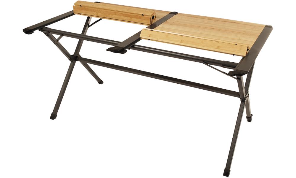 Der Premium Tisch MESA ist in den Versionen für 4 oder 6 Personen erhältlich. Die Tischplatte ist aus Bambus und kann in drei Teilen gerollt werden. Die Aluminiumbasis ist leicht und hat ein verstellbares Bein. Der Tisch wird in einer praktischen Tragetasche geliefert.
