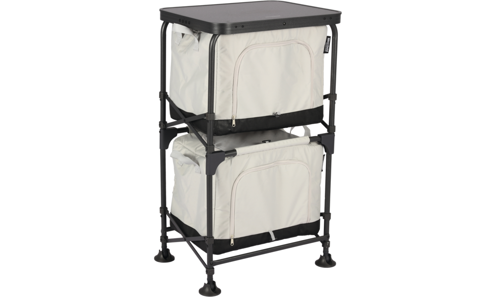 MODULOR I und II ergeben eine clevere Campingschrank-Lösung mit geringem Packmaß, die es ermöglicht per abnehmbarer Aufbewahrungs-Box, den Inhalt schon Zuhause zu bestücken. Am Campingplatz wird das Gestell des