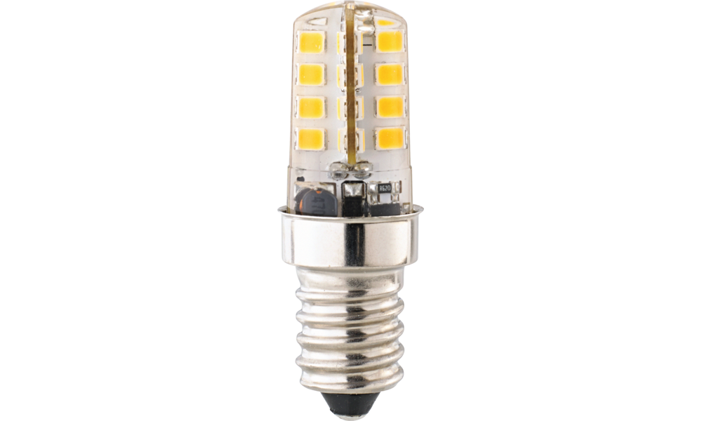 Ersatz für 25 W Halogen mit Sockel E14, Verbrauch 2,5 W, Lichtstrom 200 lm, warmweißes Licht 2.700 K, EEK F.