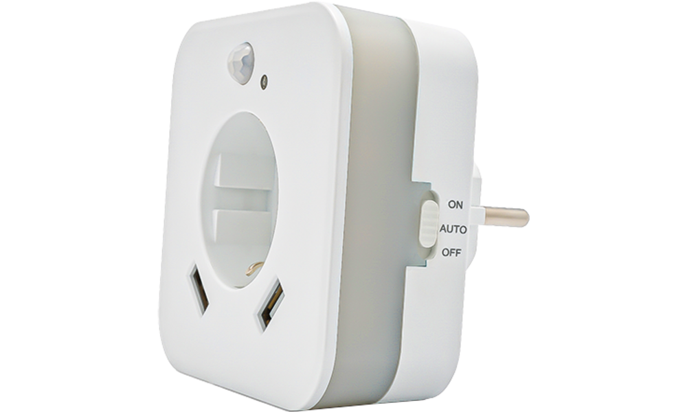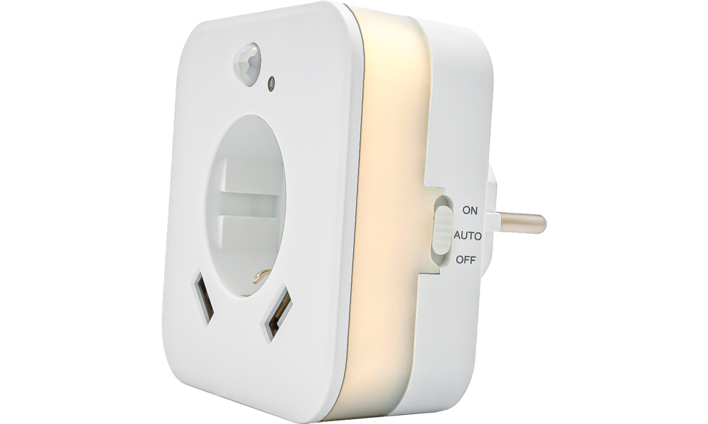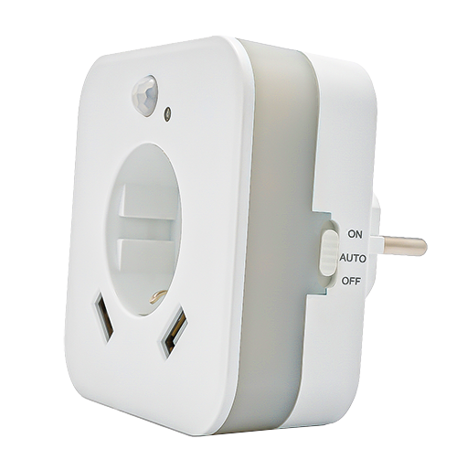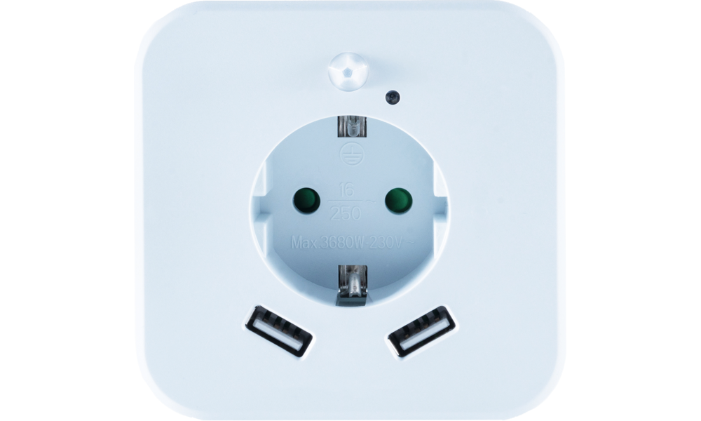 Technische Daten: Lichtfarbe 2700K, Leistung 0,3 W, Steckdose max. 3.680 W - 230 V, 2 x USB 2,4 A, Sensor Reichweite 3 m,