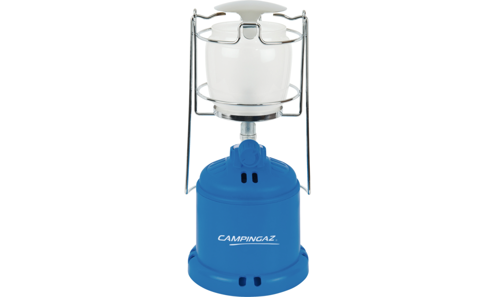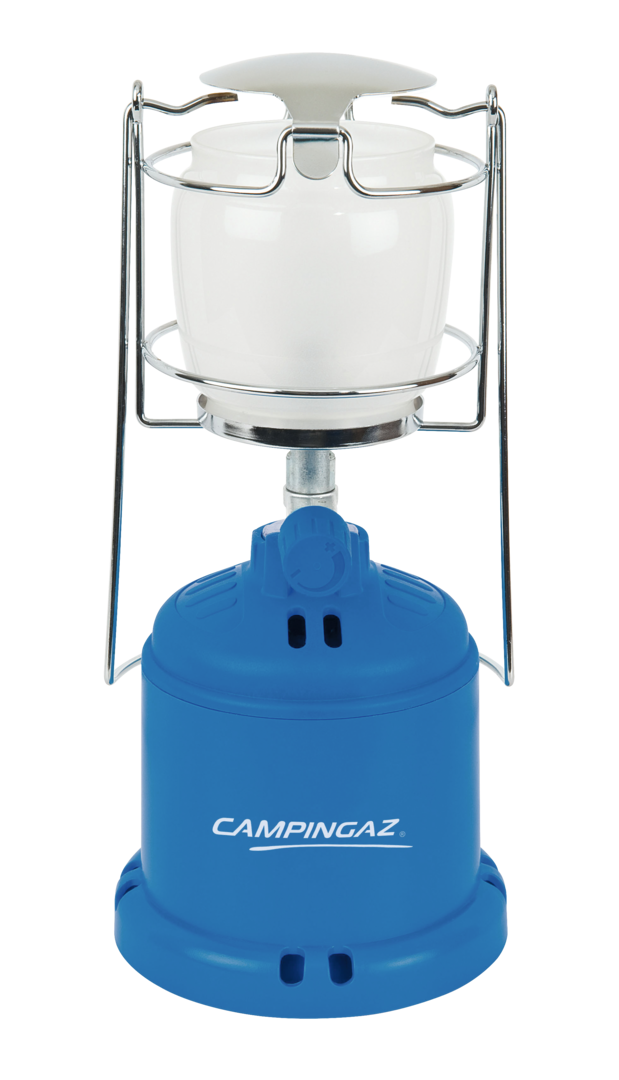 Leuchte Camping 206 L. Mit Glasschutzgitter sowie Trage- und Hängebügel. Betrieb mit Stechkartusche C206 GLS. Leistung: 10 bis 80 W, stufenlos regelbar. Verbrauch 38 g/h. Brenndauer > 5 h.