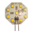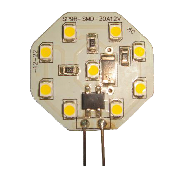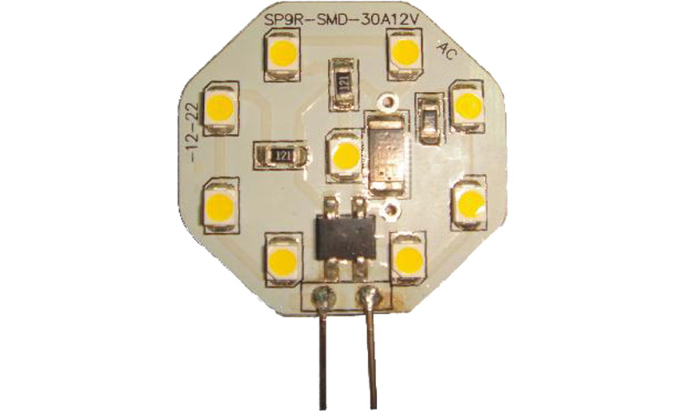 Sockel G4, 12 V, Verbrauch 0,5 W, Leuchtwinkel 125°, Lichtfarbe 2900 K, Lichtstrom 63 lm, ø 30 mm.