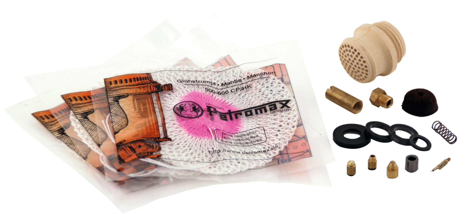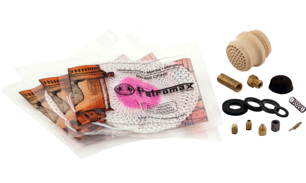 Enthält alle benötigten Bauteile, um die Lampe zu warten und instand zu halten: Tonbrenner, 3 Petromax Glühstrümpfe HK500, Manometerdichtung, Ventileinsatz, Pumpenleder, Düse, Düsennadel, Pumpenventildichtung, 2 Dichtungsringe, Graphitpackung, Ventildichtung, Ventilfeder, Ventilhülse, Fassung mit Dichtung und Schraube.