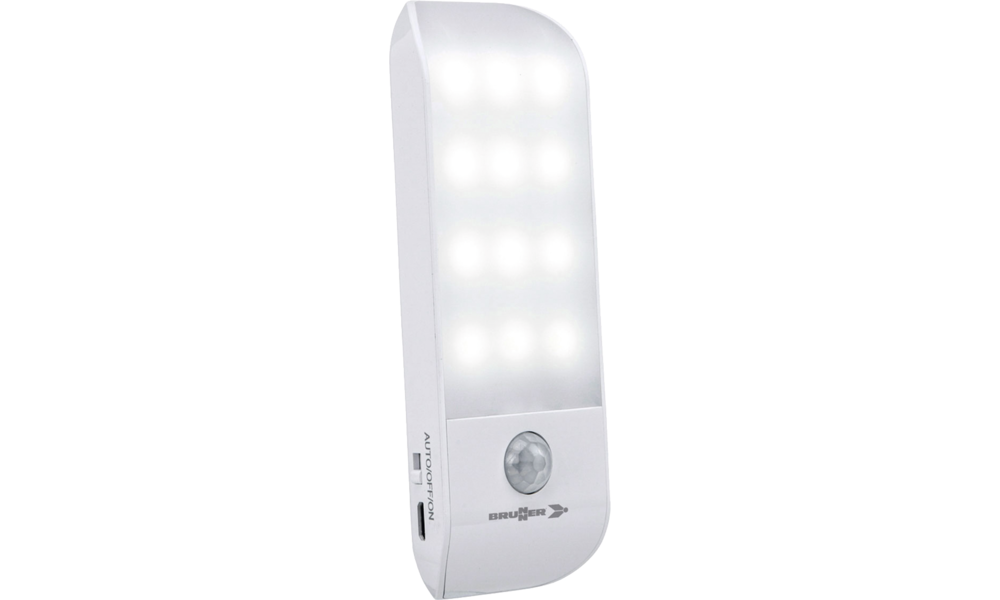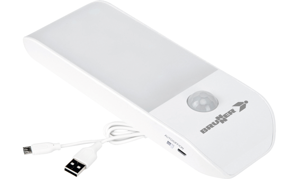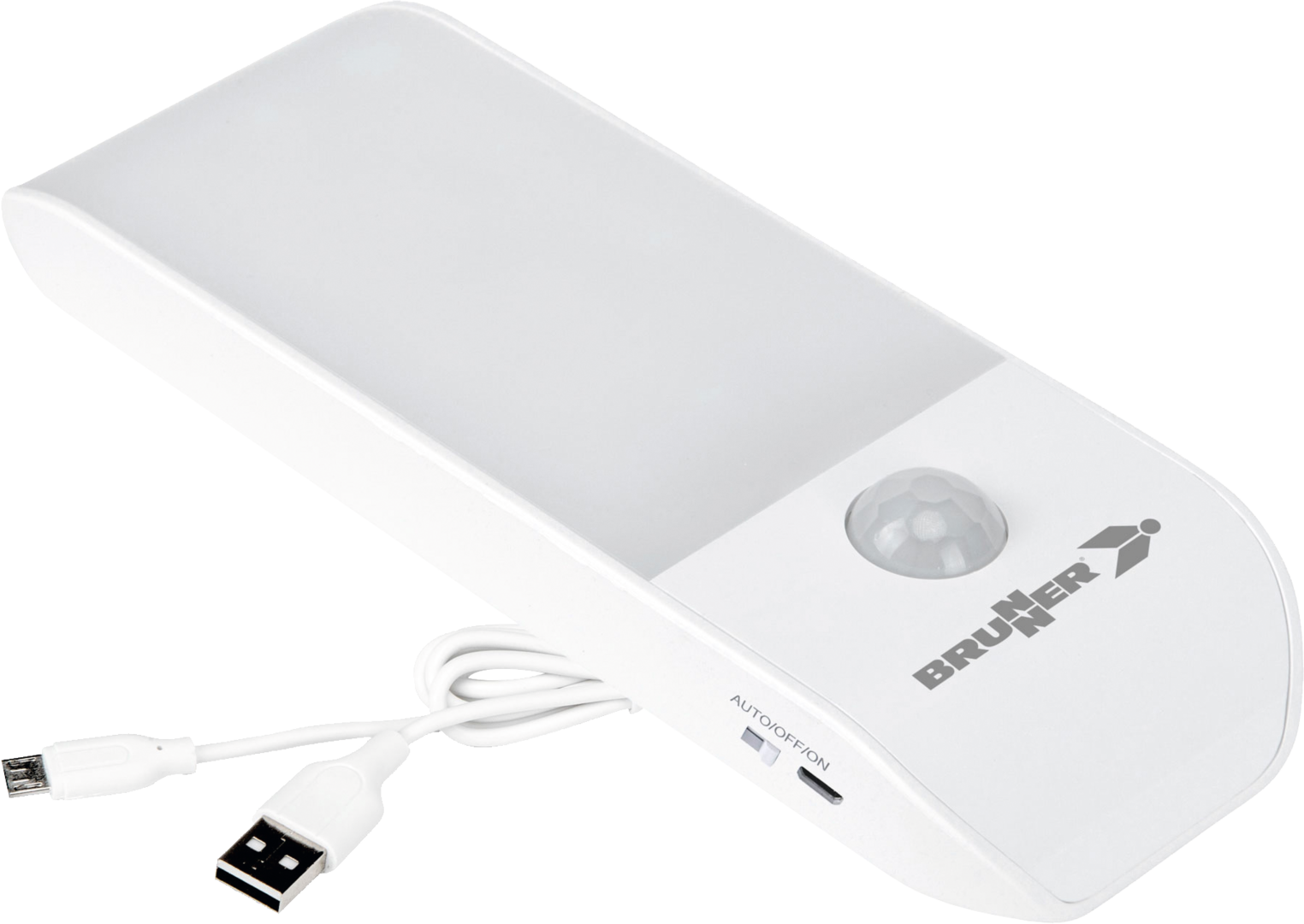 LED-Akku-Lampe für Garderoben, Eingänge, Flure, Vorratskammern, usw. Elegantes Kunststoffgehäuse mit integriertem PIR-Bewegungssensor und drei Leuchtmodi inklusive Auto Bewegungssensor. Einfaches Aufladen über einen USB-Stecker. Für die Wandmontage geeignet. Lichtstrom 240 lm. Leistung 0,75 W.