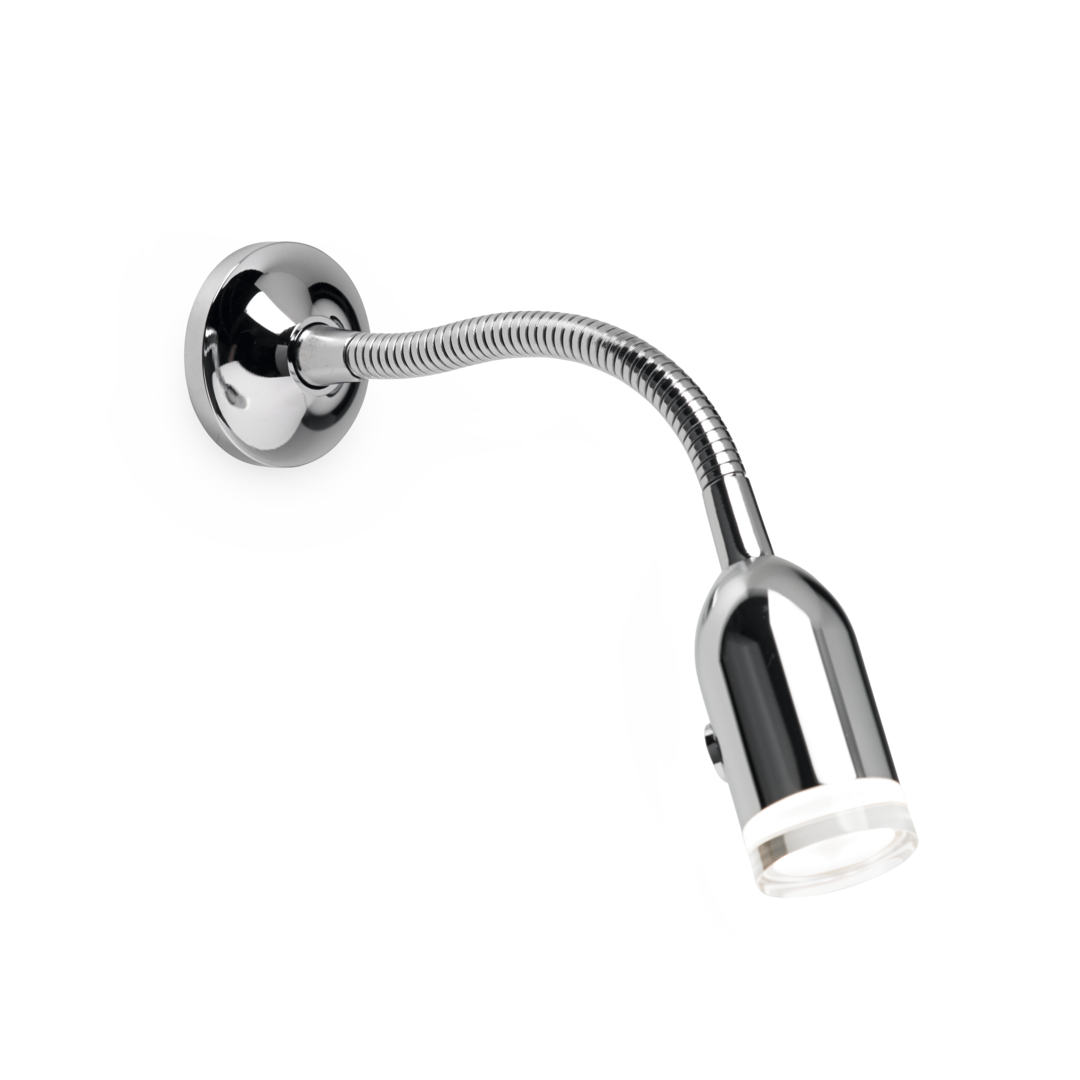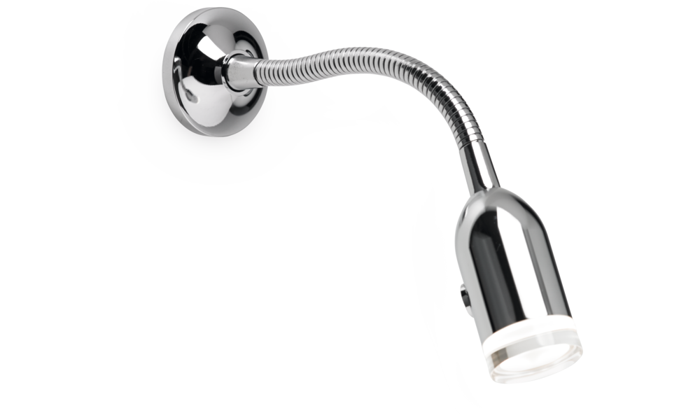 Einschließlich blauem Nachtlicht. Ideal für Schlafzimmer und Wohnbereiche. Elegantes Chrom-Design mit verdeckter Schraubbefestigung. Spannung 10 - 15 V DC, Stromaufnahme 3 W + 0,2 W (Nachtlicht), Lichtstrom 160 lm, Lebensdauer 25.000 h, Lichtfarbe warmweiß (3000 K), Energieverbrauch (in 1.000 h) 3 kWh. Material Metall.