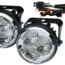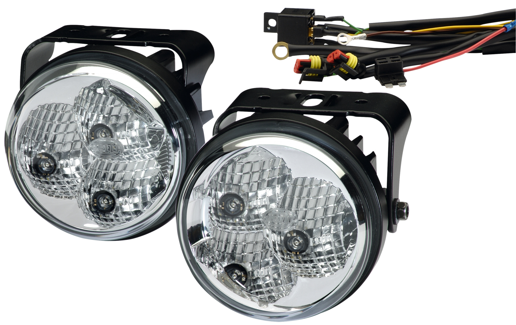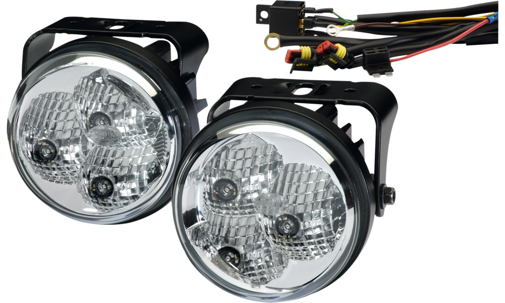 Multivolt 9 - 33 V, je drei LEDs pro Leuchte, mit schwarzem Aluminiumgehäuse, Leitungssatz mit AMP-SUPERSEAL-Stecker, mit integriertem Relais, für stehenden und hängenden Anbau in/an der Frontschürze, Set mit Bügelhalter und Profikabelsatz, ø 90 mm,