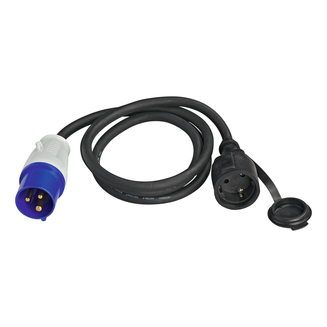 Schutzkontakt-Kupplung und CEE-Stecker 3-polig 230 V/16 A mit Klappdeckel, spritzwassergeschützt, Gummileitung H07RN-F 3G