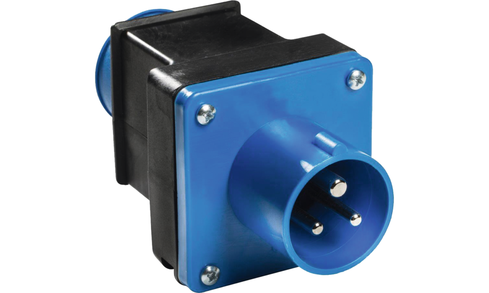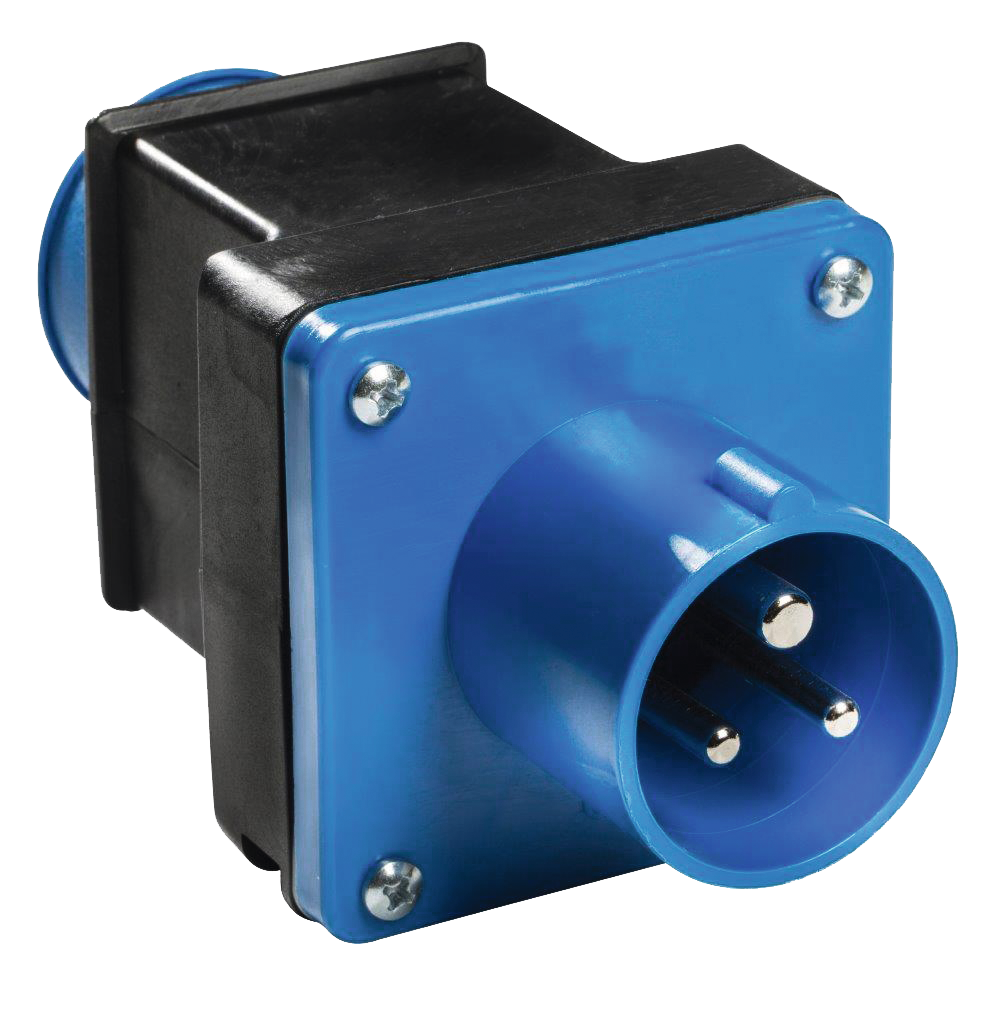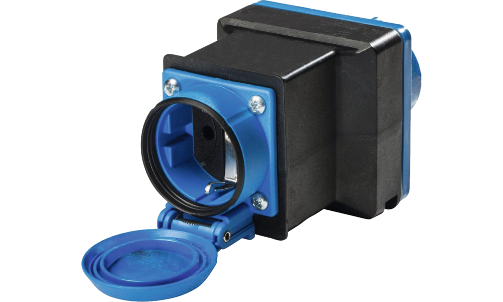 CEE-Stecker auf Schukosteckdose mit Klappdeckel. 230 V/16 A. Spritzwassergeschützt.