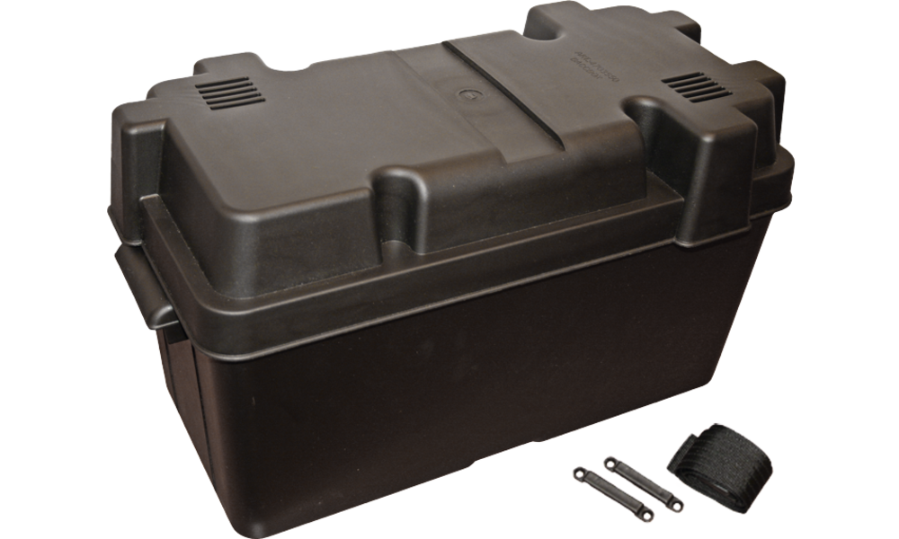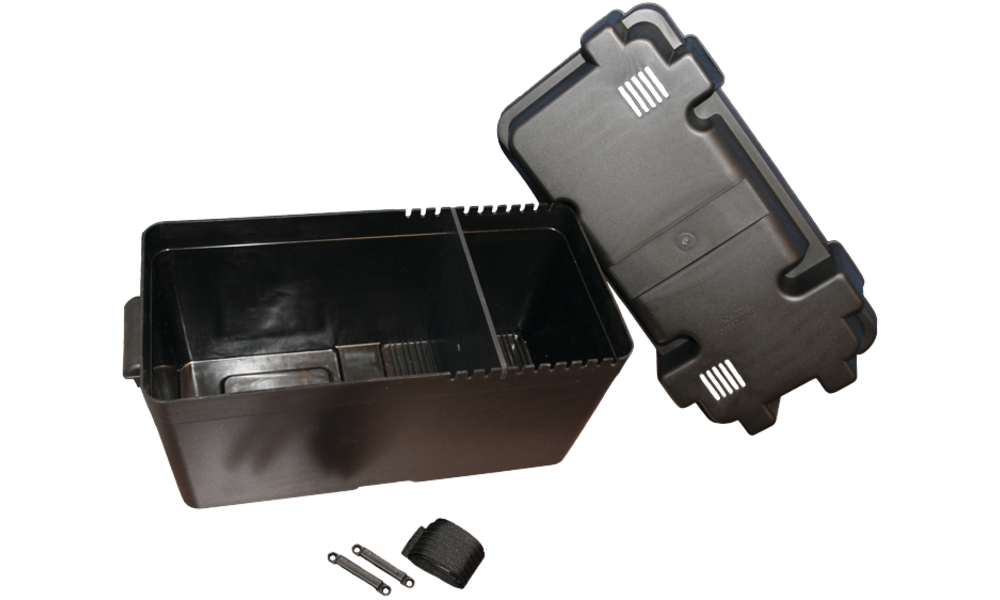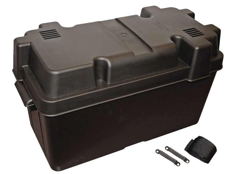 Aus Kunststoff, mit einsetzbarer Trennwand und Befestigungsgurten.