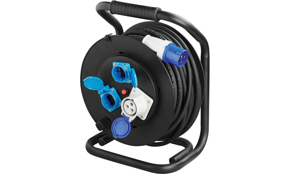Mit Thermoschutzschalter, 2 Schutzkon-takt-Steckdosen (230 V), 1 CEE-Steckdose (230 V, 16 A, 3-polig) und CEE-Stecker (3-polig, 16 A).