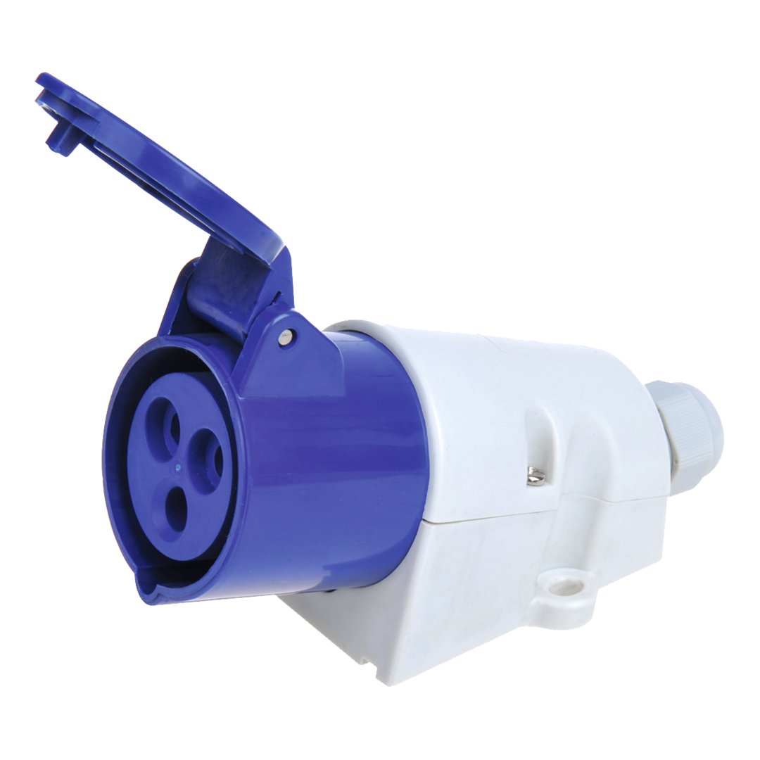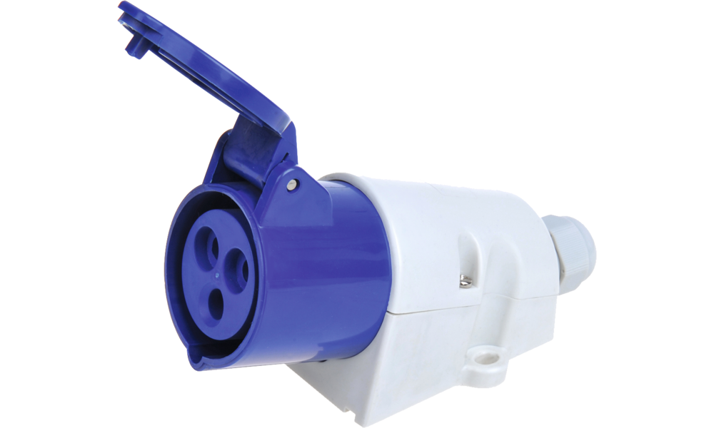 3-polig, 230 V/16 A, spritzwassergeschützt (IP44).