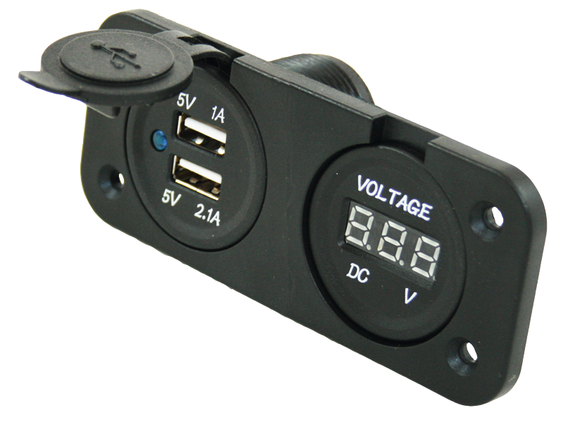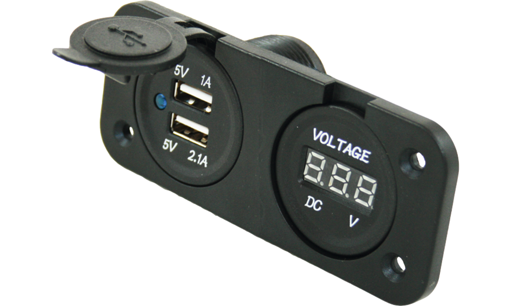 Eingang 12 V, Ausgang 5 V. Mit 2 USB-Anschlüssen: 1 x 2.100 mA für z. B. iPad®, Tablet, iPhone® und 1 x 1.000 mA für z. B. iPhone®, Smartphone. Inklusive Batteriespannungsanzeige.