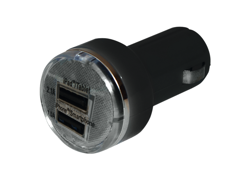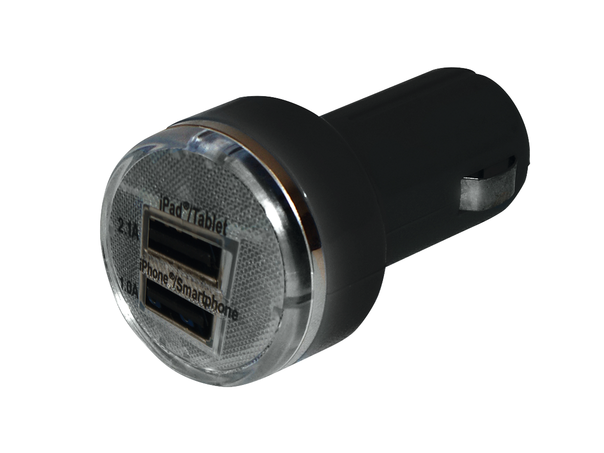 Mit 2 USB-Anschlüssen: 2.100 mA, 1.000 mA. Mit optischer LED-Funktionsanzeige. Automatische Sicherung bei Kurzschluss und Überhitzung. Abmessungen ø 3 cm, Länge 6 cm.