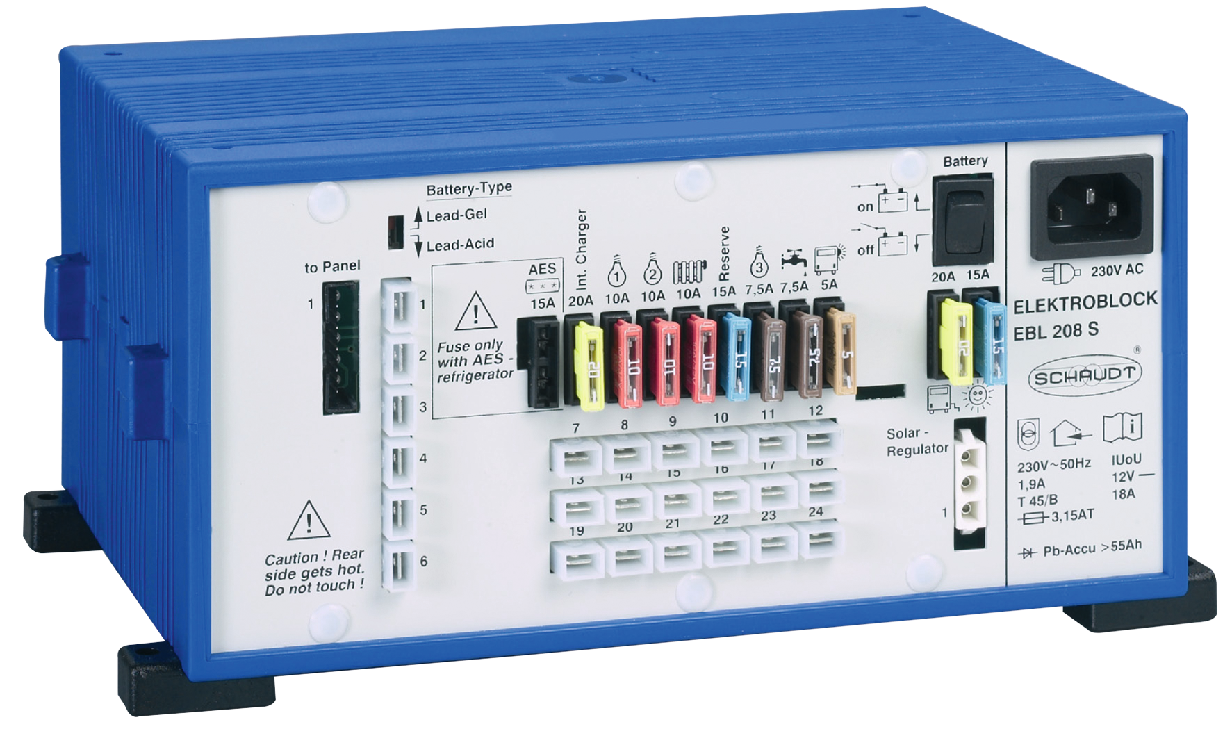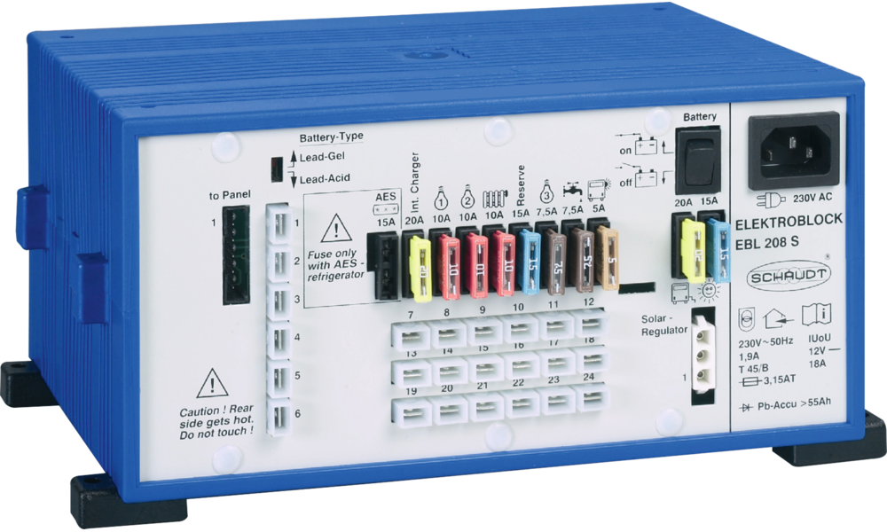 Der Klassiker. Der Elektroblock enthält ein Batterielademodul, koordiniert den kompletten 12 V-Stromkreis und übernimmt noch weitere Steuerungs- und Regelungsfunktionen.