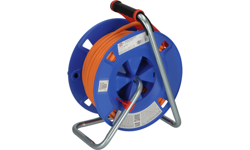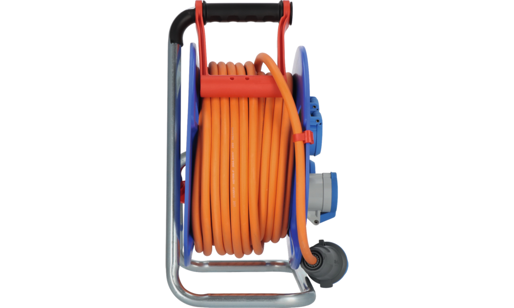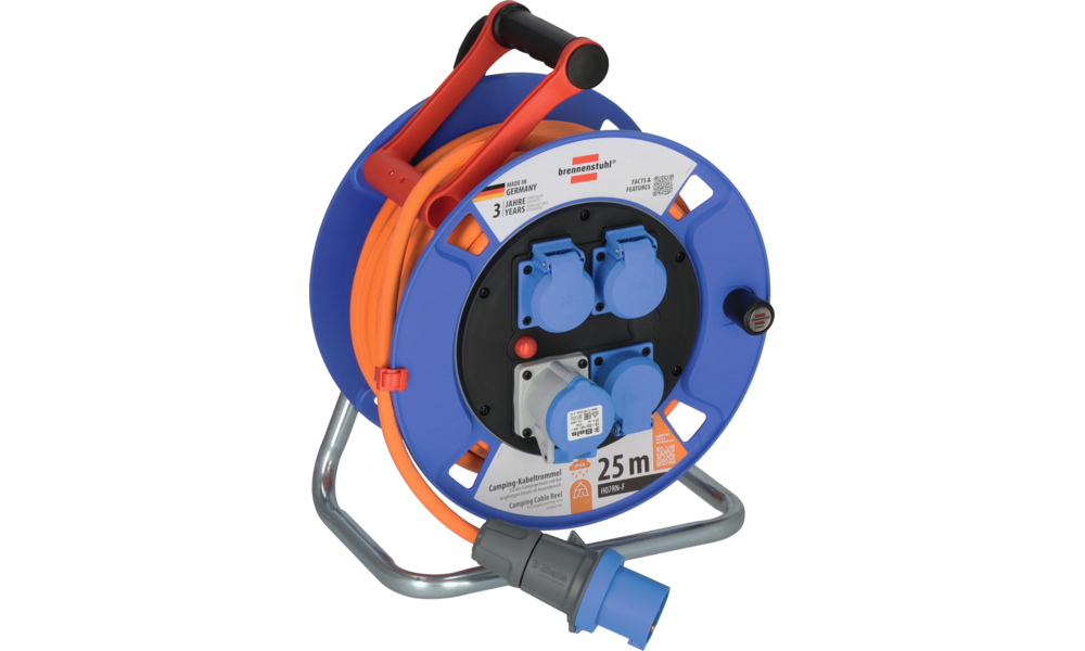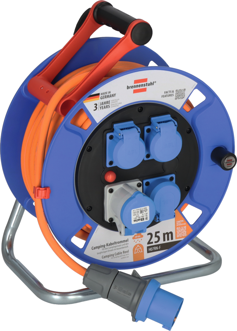 Für den Campingeinsatz und den ständigen Einsatz im Freien, IP 44. Ausstattung: CEE-Stecker 230 V/16 A, 1 CEE-Steckdose 230 V/16 A, 3 spritzwassergeschützte Schutzkontakt-Steckdosen 230 V, Trommelkörper aus Spezialkunststoff auf verzinktem Tragegestell, innovativer Tragegriff „cablepilot“ für perfekte Kabelführung, pendelt auf beiden Seiten und ermöglicht bequemes Tragen und Aufhängen, Kabel (H07RN-F 3G2,5) in Signalfarbe orange. Kabellänge 25 m.