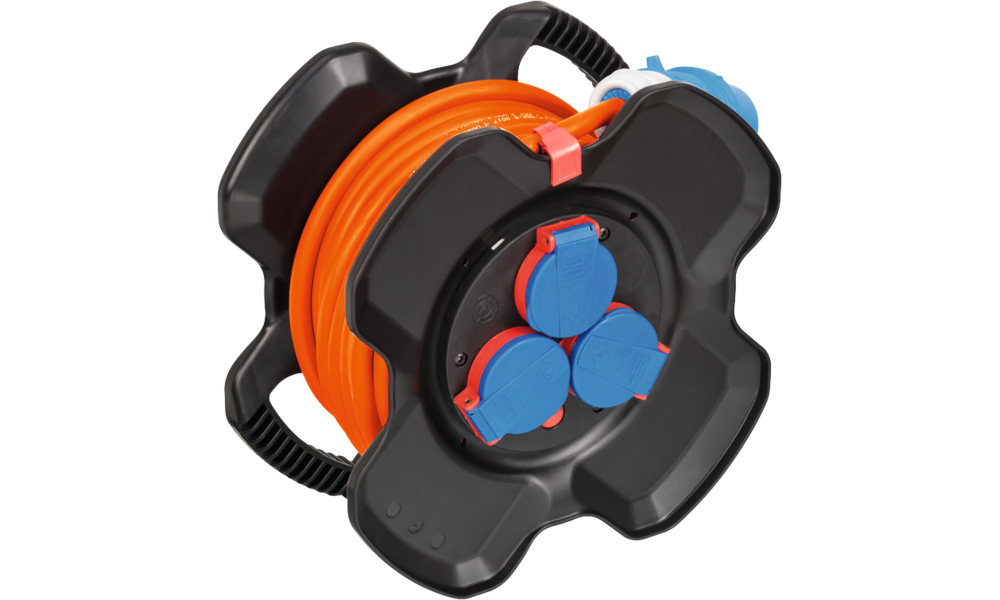 Robuste CEE-Kabeltrommel mit 3 Schukosteckdosen (230 V, spritzwassergeschützt mit selbstschließenden Deckeln) und 2 CEE-Steckdosen (230 V/16 A) eignet sich perfekt für den Campingplatz.
