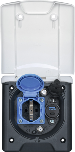 Schuko-Steckdose 230 V/16 A, 2 x Sat-Anschluss, 1 x USB-C-Anschluss, 1 x USB-A-Anschluss.