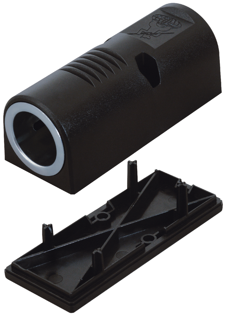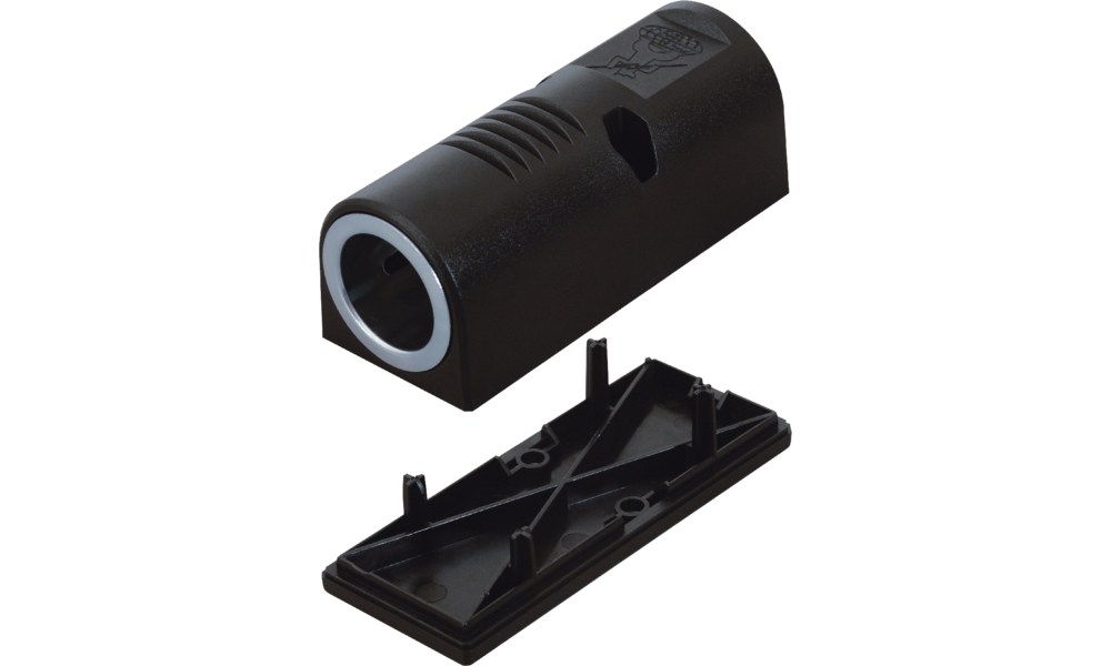 Mit Bodenplatte zur Errichtung fliegender Kupplung. Innen-ø 21 mm mit Flachsteckeranschluss 6,3 mm passend für Universalstecker.