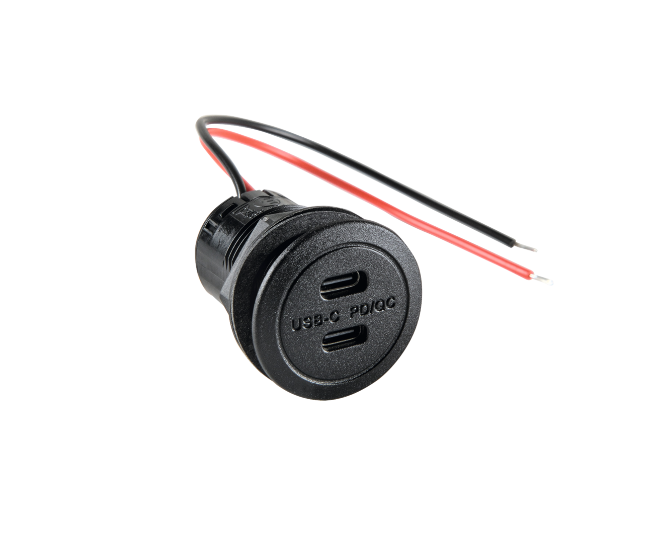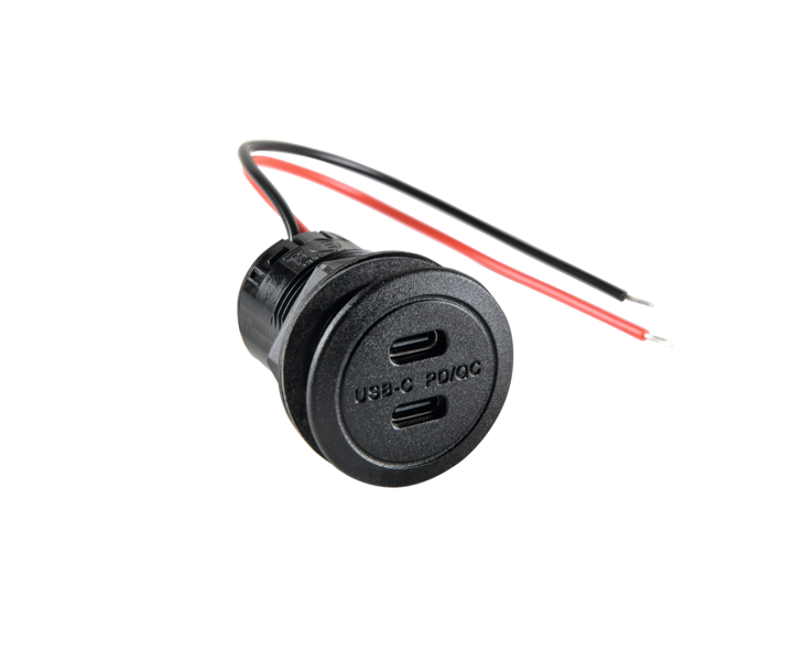 12-24 V mit integriertem Spannungswandler. Unterstützt die Schnellladeverfahren Power Delivery, Quick Charge und PPS. 2 x USB-C: 5 V, 9 V, 12 V und bei 24 V Eingangsstrom auch 15 und 20 V; max. 2 x 3 A (2 x 30 W).