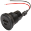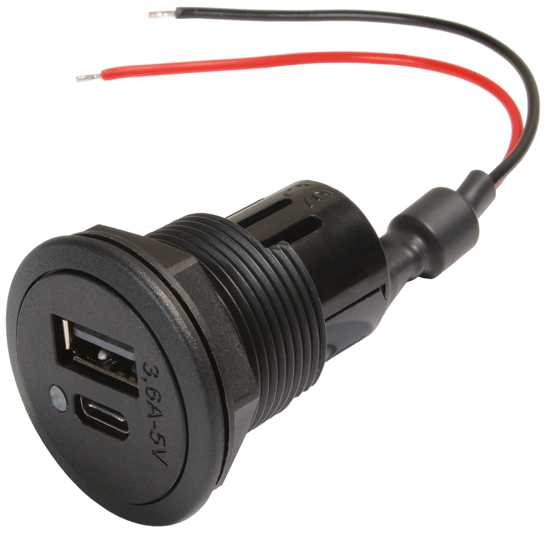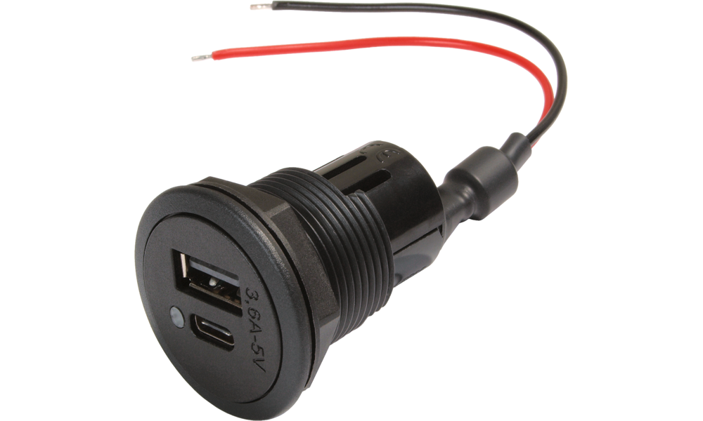 12-24 V/5 V, 3,6 A mit integriertem Spannungswandler und blauer LED. Befestigung mittels Sechskantmutter, Einbaumaß ø 28 mm.
