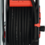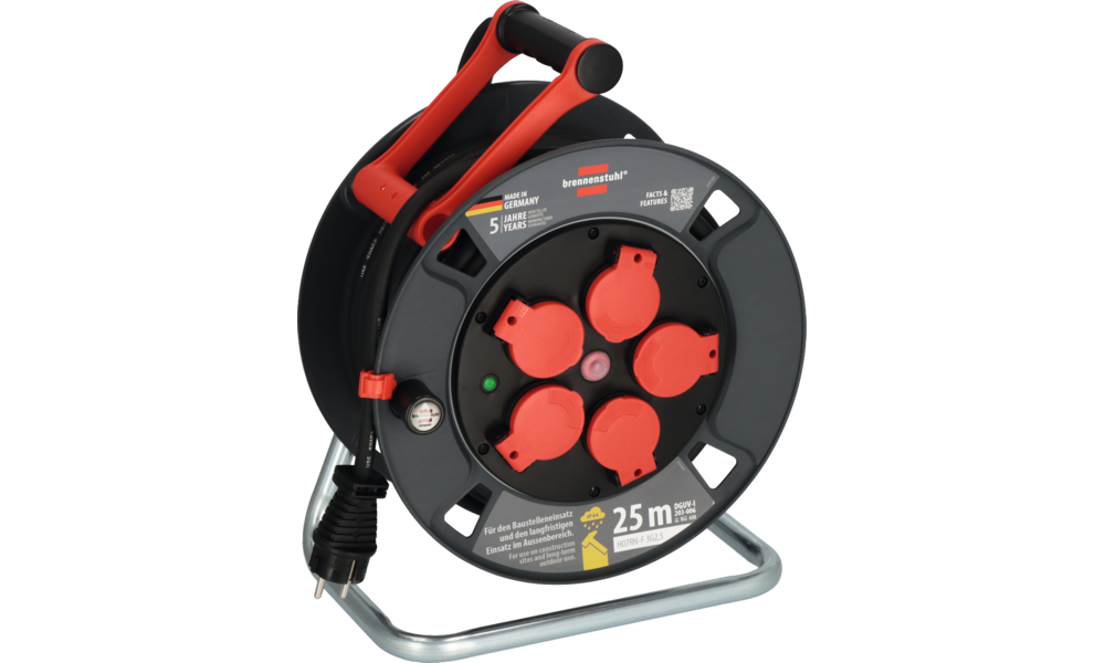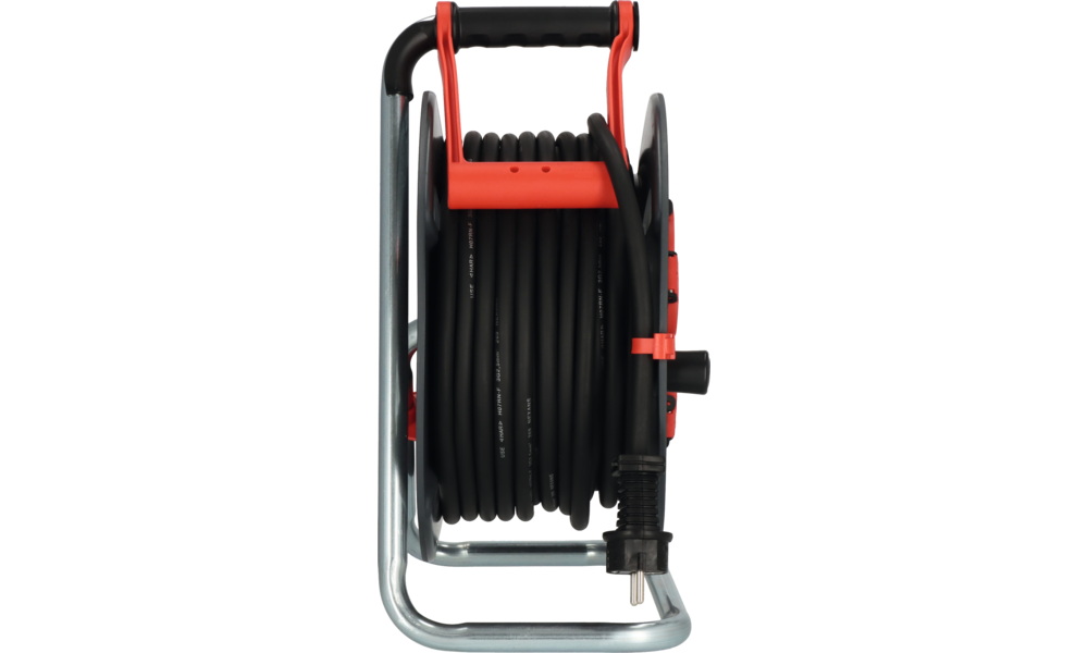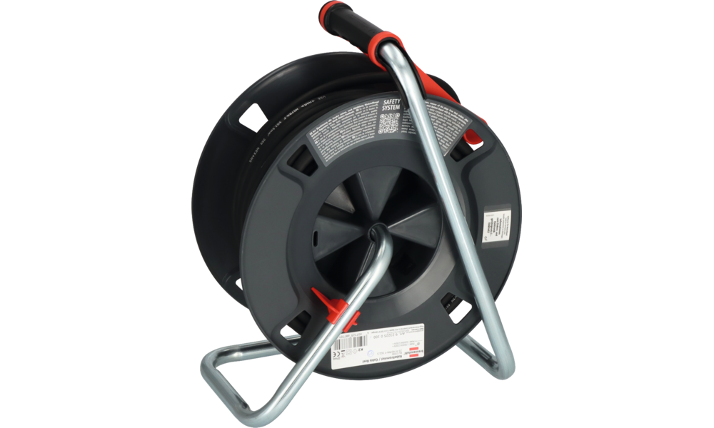 Kontroll-Leuchte bei Überhitzung und Überlastung, optische Bereitschaftsanzeige im Steckdoseneinsatz, Trommelkörper aus Spezialkunststoff auf verzinktem Tragegestell, Trommelbremse auf der Rückseite, innovativer Tragegriff „cablepilot“, RN-Kabel (H07RN-F 3G2,5),