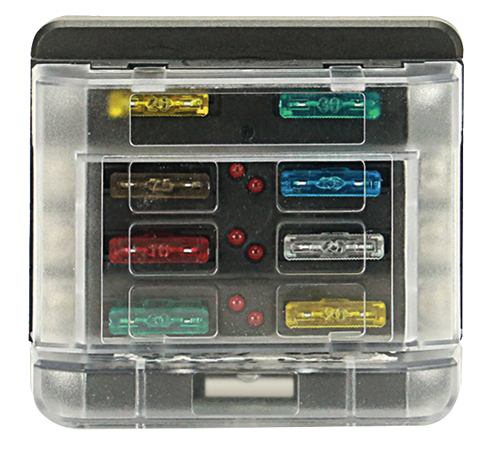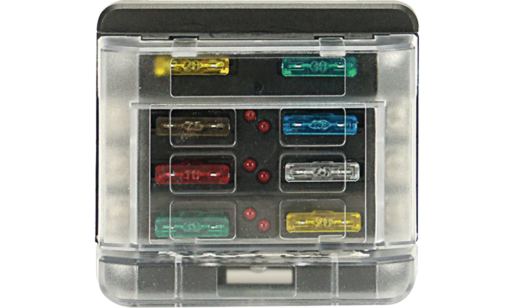 Die Stromzuführung erfolgt über einen Zentraleingang (M 5). LED-Anzeige für defekte Sicherungen.