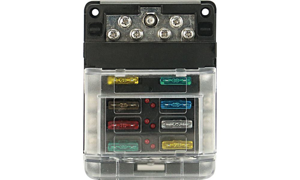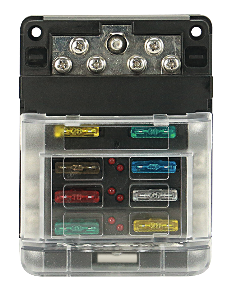 Ausgänge belastbar bis 30 A, Gesamtbelastung 100 A. Lieferung ohne Sicherungen (Typ: FS). Betriebsspannung 12/24 V.