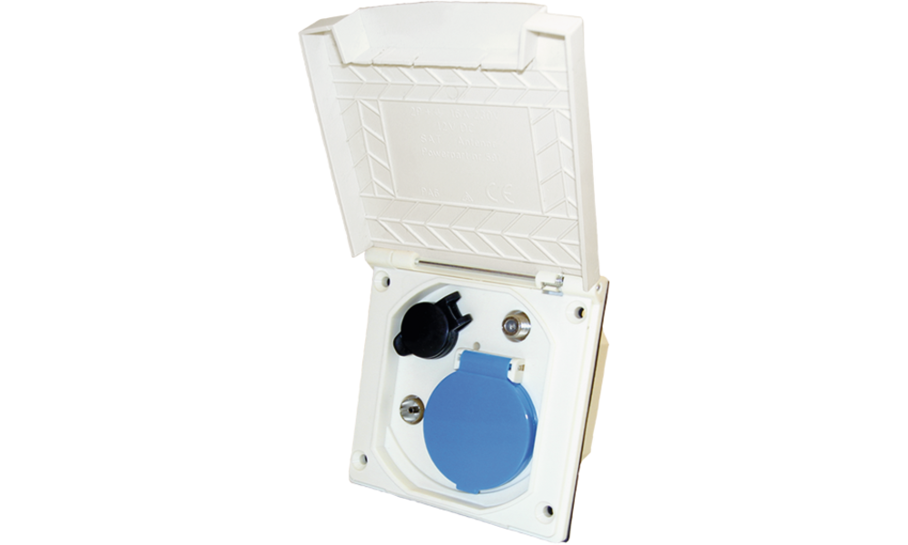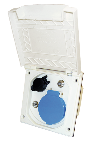 Schuko-Steckdose 230 V, 12 V-Steckdose und TV-/Sat-Anschluss.