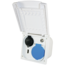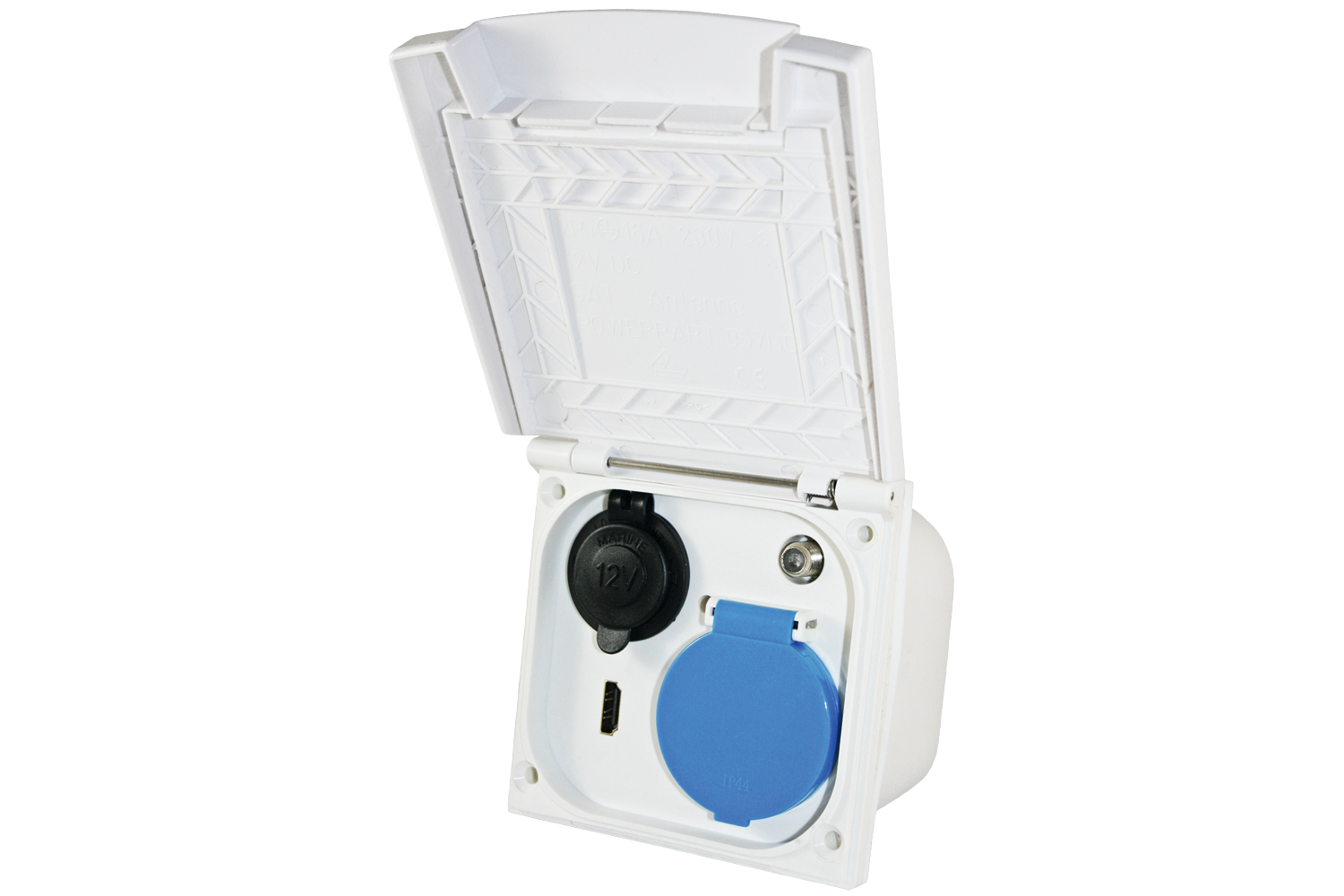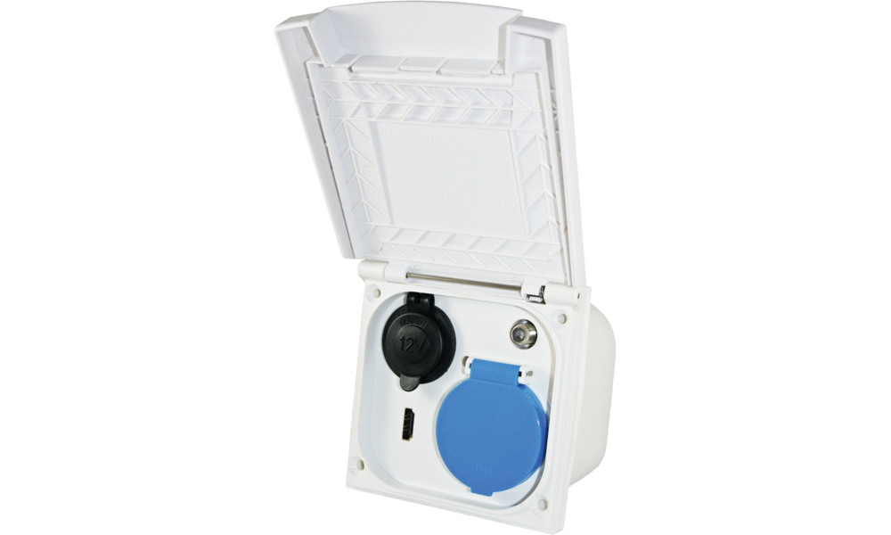 Schuko-Steckdose 230 V, 12 V-Steckdose, HDMI- und Sat-Anschluss.