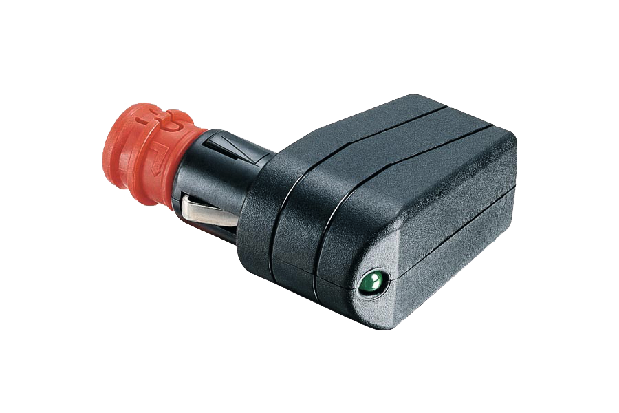 Integrierte Reitersicherung 7,5 A/12-24 V, festarretierbare Ausgleichshülse durch Bajonettverrastung und Schraub-Zugentlastung, bis max. 1,5 mm² Kabelquerschnitt, ø 8 mm, passend für Zigarettenanzünder- und Normsteckdosen nach DIN EN ISO 4165.