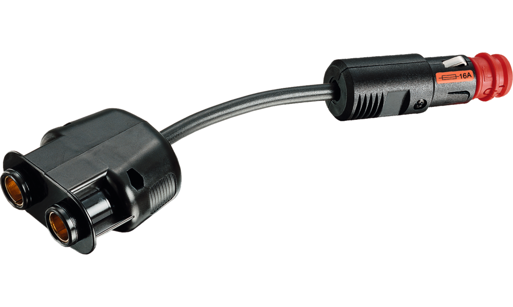 Zwei Normsteckdosen mit Kontakten nach DIN EN ISO 4165, max. 16 A/12-24 V, flexibler Anschluss an das Bordnetz über den TÜV-geprüften Sicherheits-Universalstecker mit auswechselbarer 16 A-Sicherung.