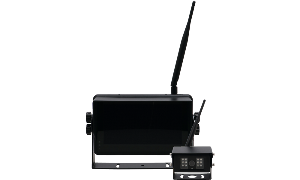 Funk-Rückfahrvideosystem mit 7"-Touchscreen- Monitor und Farbkamera. Der Monitor bietet mehrsprachige Unterstützung und ermöglicht die Anpassung von Helligkeit, Kontrast und Farben sowie