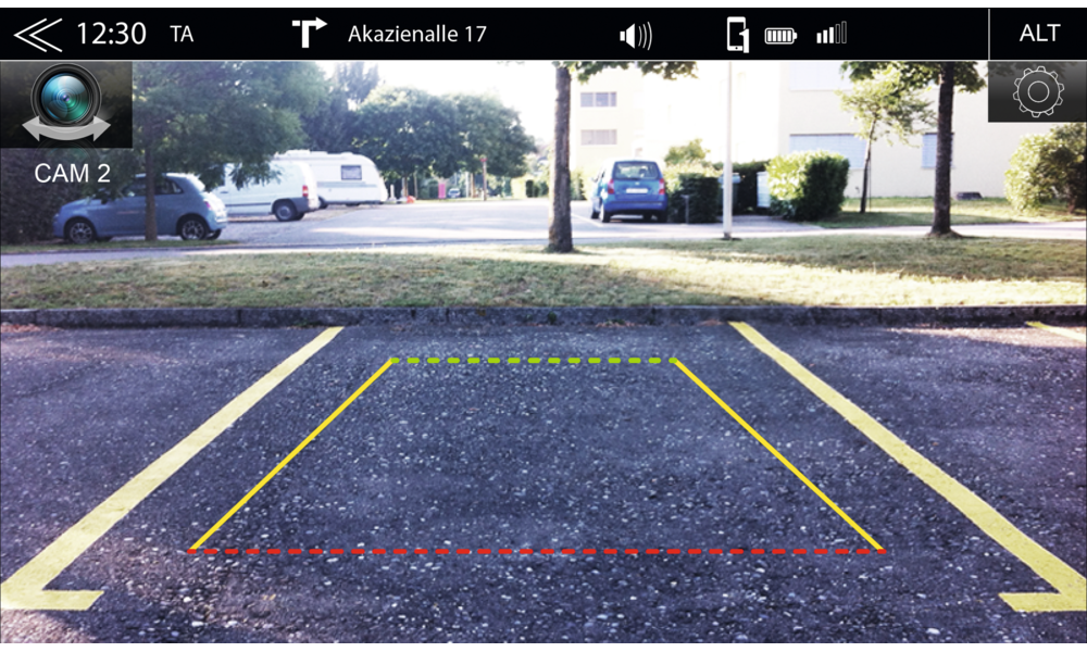 Der X-127 hat zwei Kamera-Eingänge (CVBS) mit geschalteter Stromversorgung und verfügt über eine automatische Rangier-/Umschaltfunktion, die durch Einlegen des Rückwärtsgangs aktiviert wird. Zur besseren Distanzeinschätzung können Sie Hilfslinien einblenden und einstellen.
