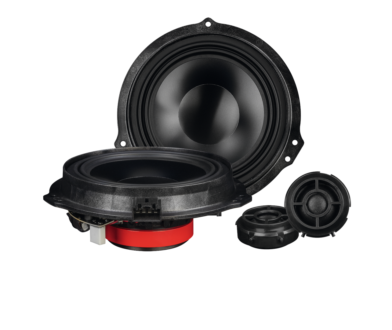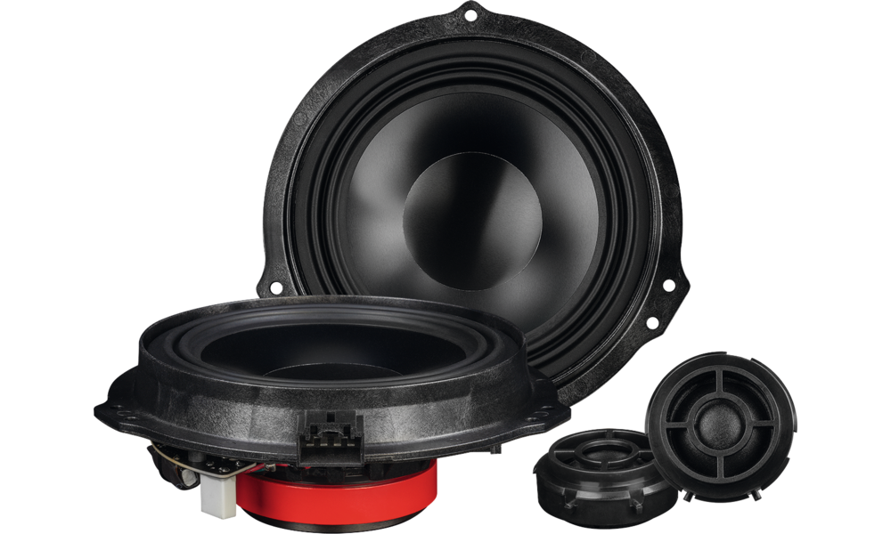 Plug & Play 2-Wege Kompo für Ford Transit (7. Gen) und Transit Custom und plattformverwandte Tourneo Modelle: Tieftöner mit Aluminium Membran für eine detaillierte Klangperformance, Cambridge-Sicke für eine hohe lineare Membranauslenkung, leistungsstarker Magnet, 25 mm Gewebehochtöner,