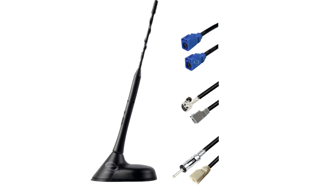 23 cm Antennenstab, 12 V-Stromversorgung der FM/ DAB Verstärker über Innenleiter oder externen Kabelanschluss mit DIN-Steckhülse, inklusive je 6,5 m FM (DIN), DAB+ (SMB) und GNSS (FAKRA) Anschlusskabel.