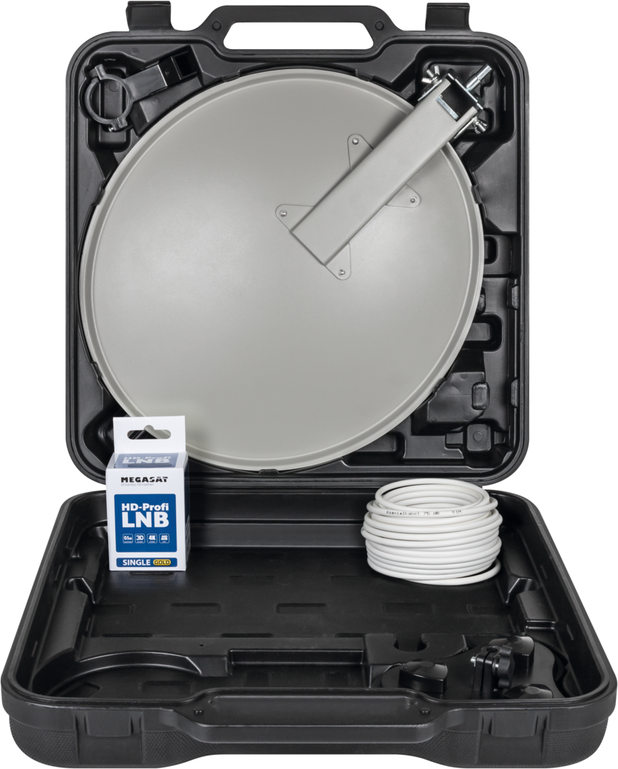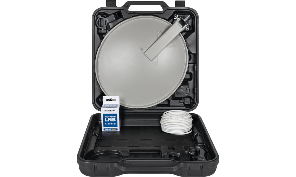 Lieferumfang: Megasat Campingkoffer (Kunststoff), Satellitenspiegel 41 x 38 cm (Stahl), 3-fach-Saugfuß, Standfuß, Masthalterung, Single-LNB, 10 m Koaxialkabel, 2 x F-Stecker, 1 x Gummitülle, Montagezubehör,