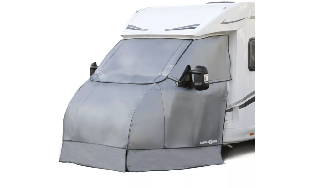 Zweiteilige Fahrerhaus-Isoliermatte. Windschutzscheibe und Motorhaube können je nach Jahreszeit und Situation zusammen oder getrennt abgedeckt werden. Effiziente Isolierung dank mehrlagigem Material. Mit Rundum-Erdstreifen.