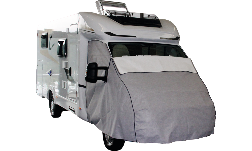 Diese Weiterentwicklung der Frontschutzplane für Reisemobile schützt das Fahrerhaus vor Vereisung und Schnee sowie ungewünschten Einblicken.