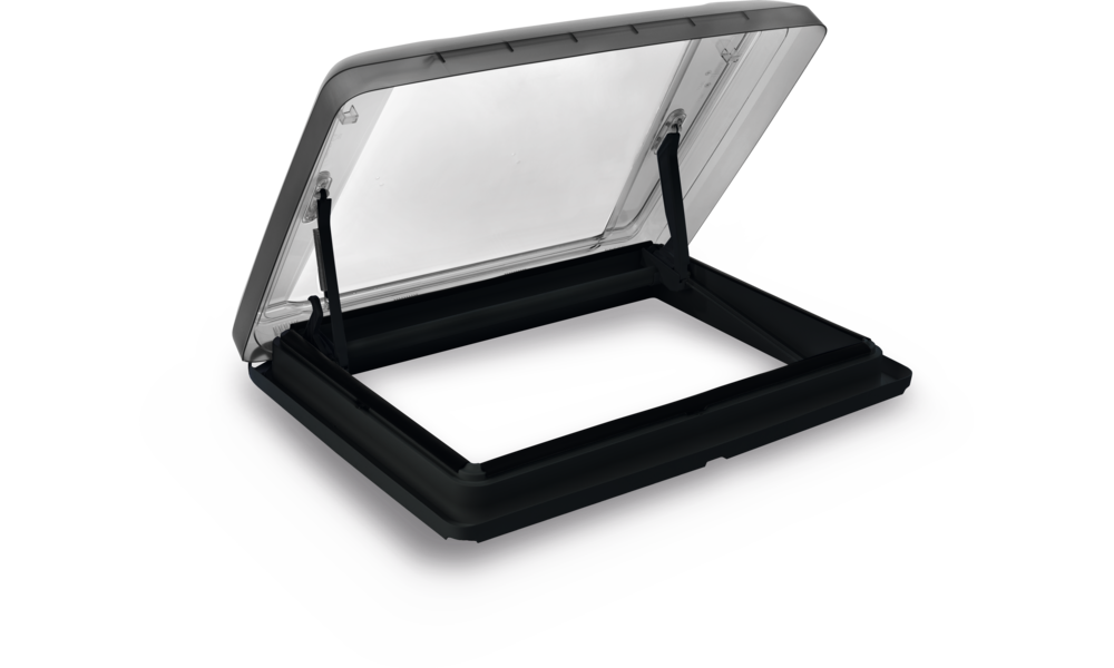 Bedienfreundliche Dachhaube mit robuster Doppelverglasung und Bügelaufsteller, moderner Innenrahmen mit Doppelplissee.